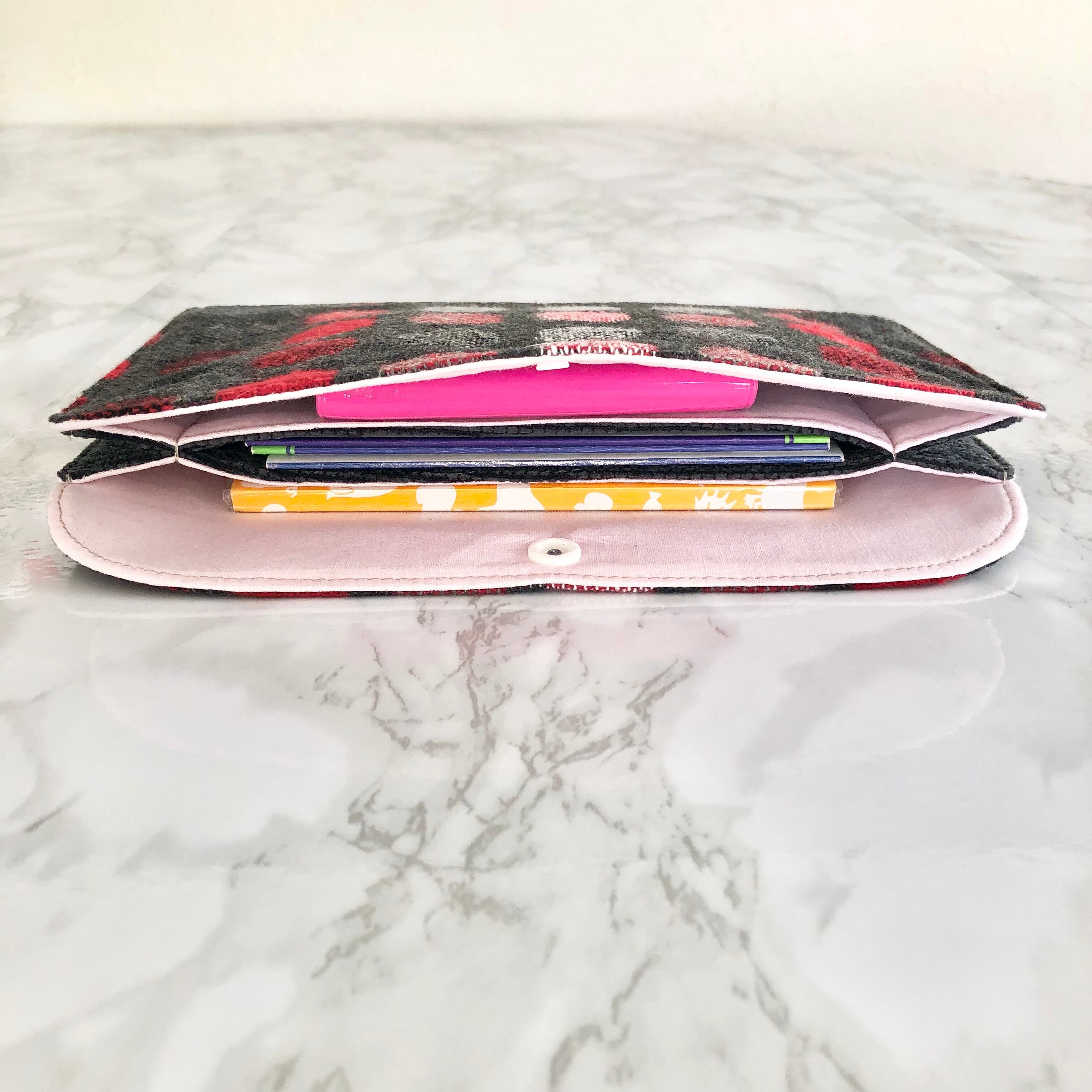 中は3つのポケットに分かれており、通帳・母子手帳・カード・ハンカチ類やレシートなども入れられます。