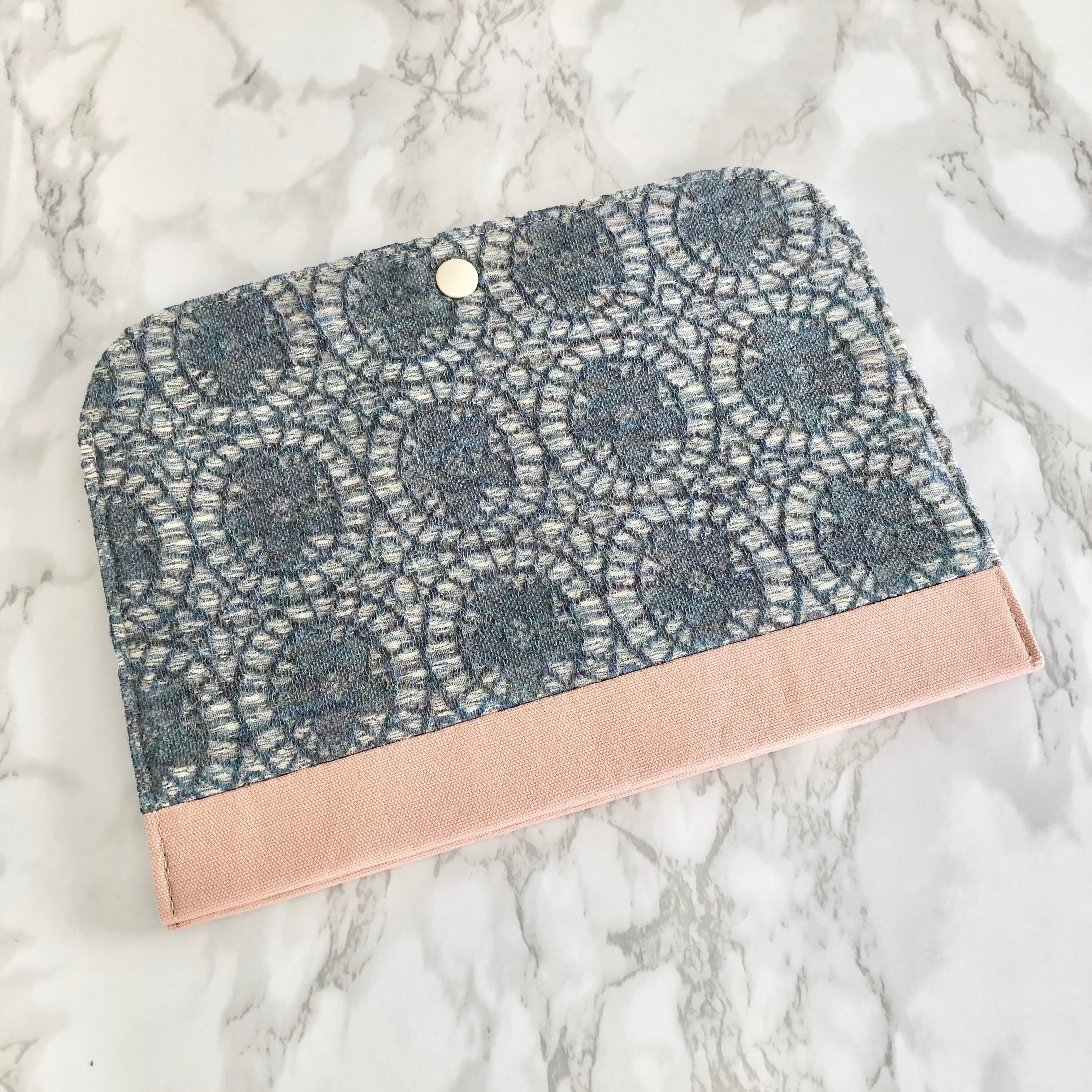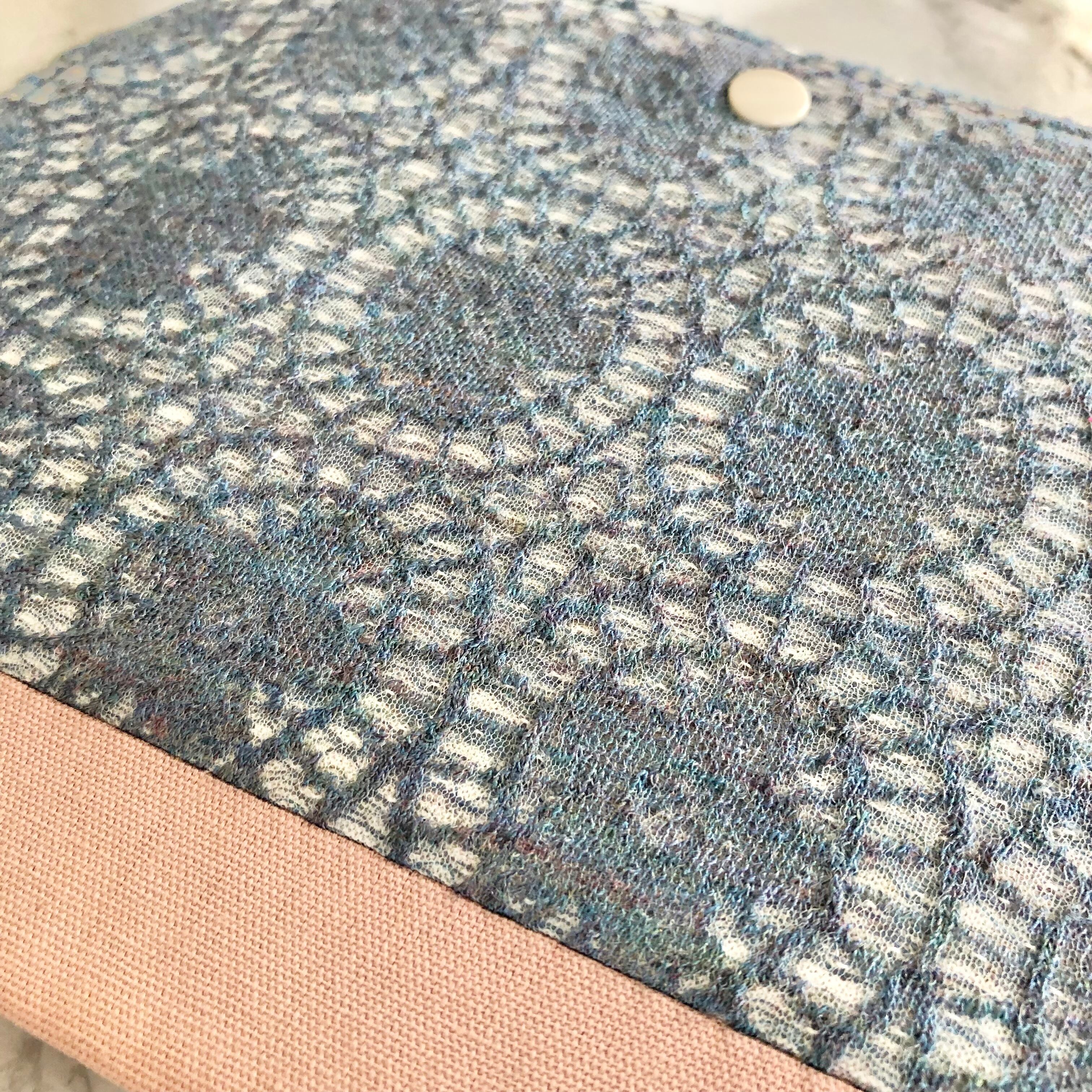 表はレース柄とくすみピンクのツートン、裏地はくすみブルーで製作しました。