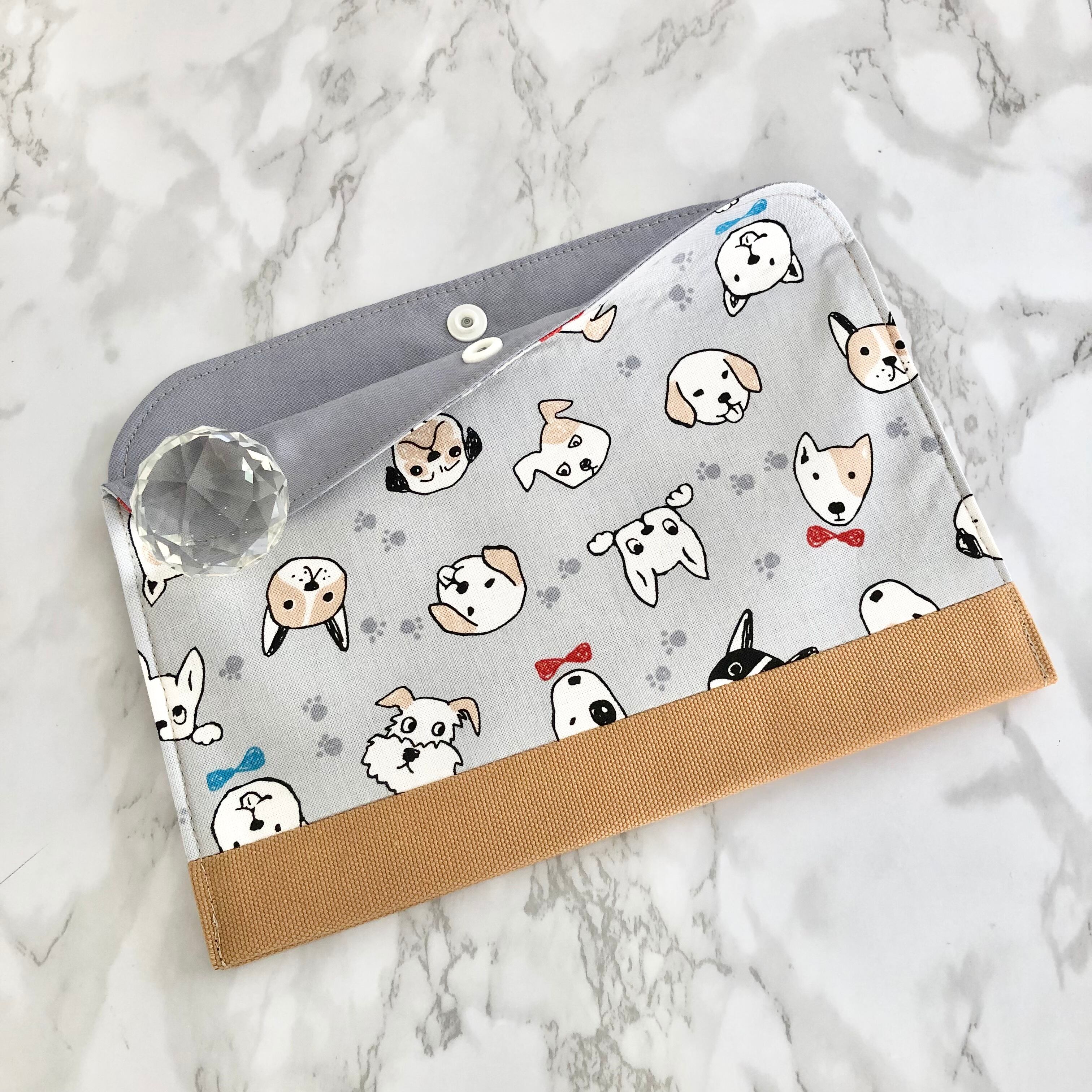 ⚫︎ 表はワンちゃん柄とキャメルのツートン、内側はグレー生地で製作しました。